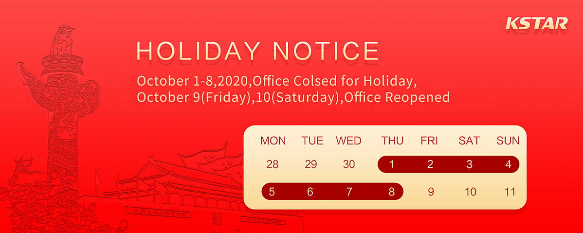 Aviso de feriado para o Dia Nacional Chinês de 2020